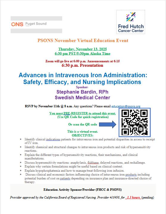 PSONS welcomes you to its November virtual education event called “Advances in Intravenous Iron Administration: Safety, Efficacy, and Nursing Implications”.